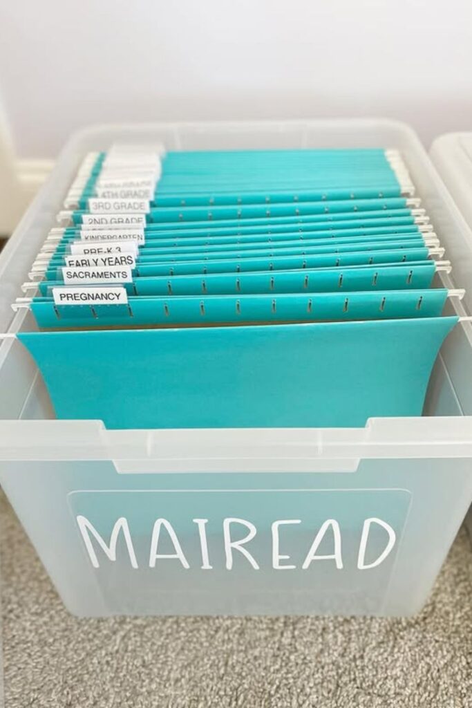 That is big enough to house hanging folders and a set of labeled tabs. Putting the bin on a shelf in the closet, the office, or beneath the desk keeps everything safe but still easy to get to.