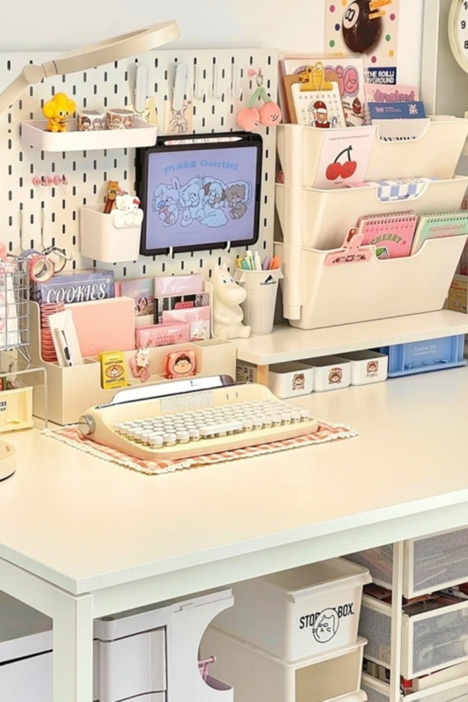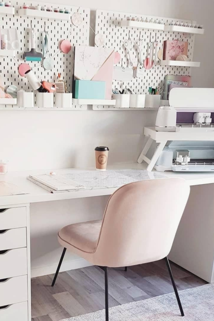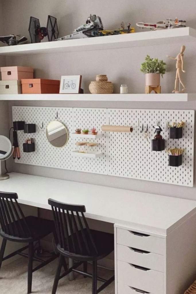 Visual order makes desk time feel lighter and more focused. Using a pegboard to lift stationery, notes, and small decor.
