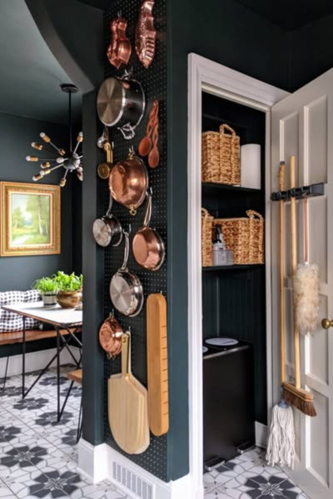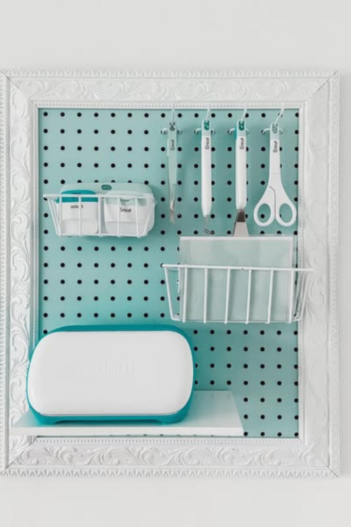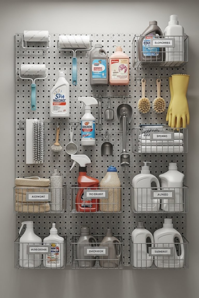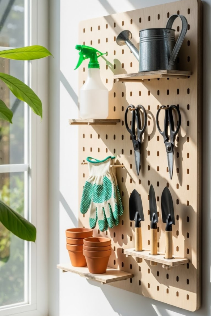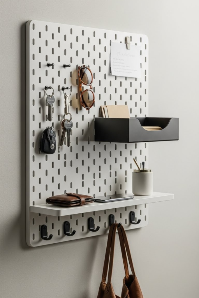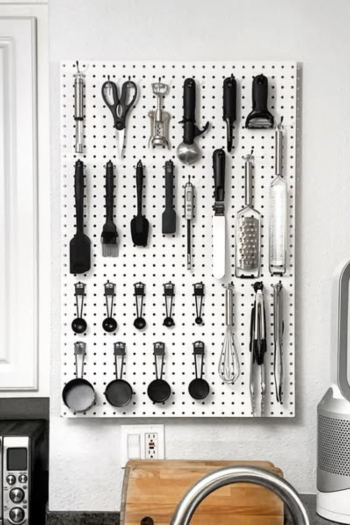 A pegboard keeps items visible, organized, and easy to reach, saving time and reducing clutter. It uses vertical wall space.