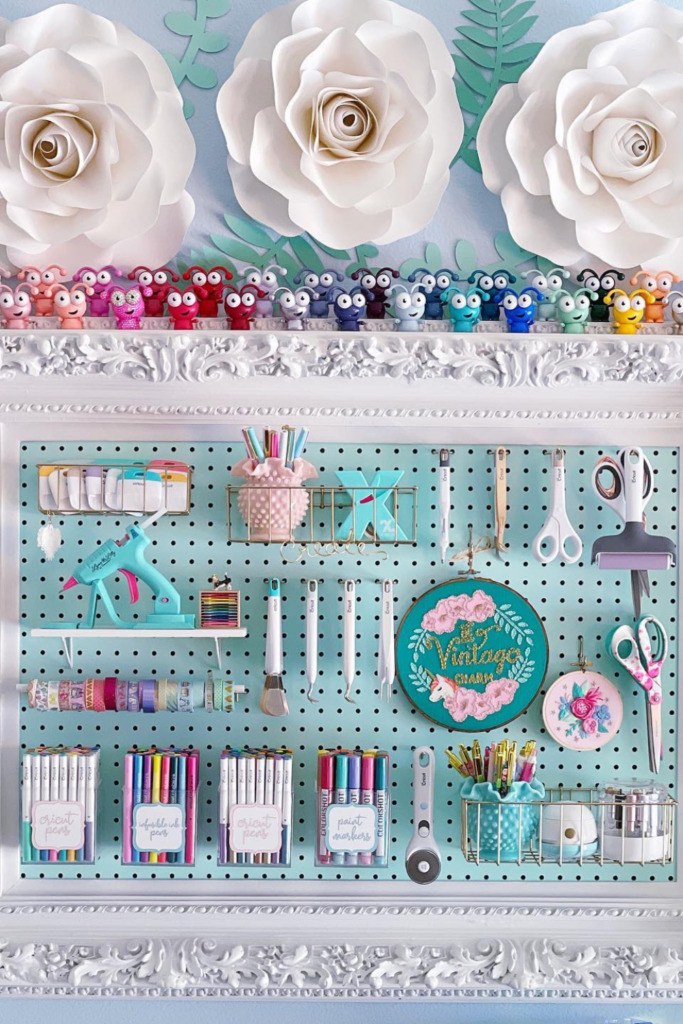 Creative storage feels intentional. Framing the board turns everyday tools into part of the décor, which works well.