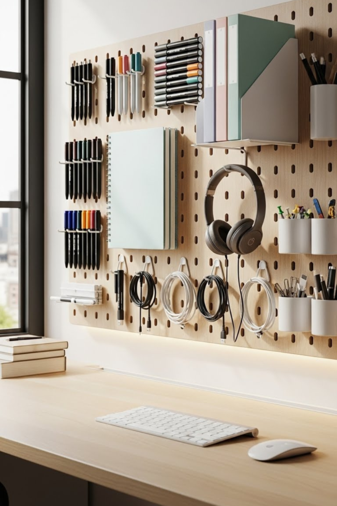 Focus improves when the wall stays useful but not busy. Keeping only daily tools on the pegboard prevents visual.