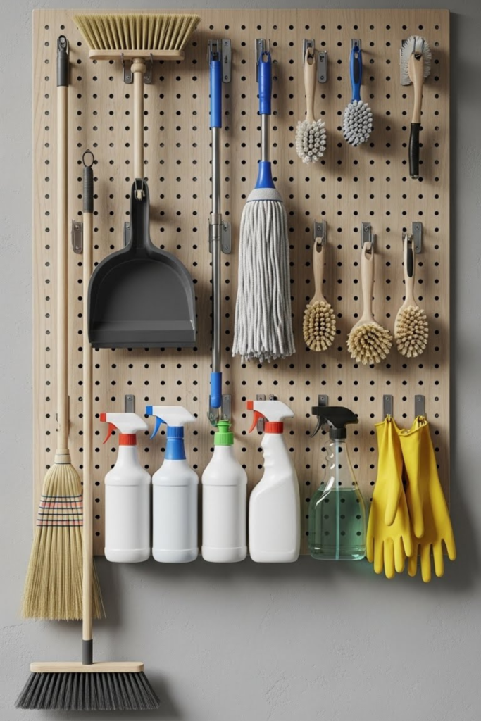 Storage closets feel bigger when cleaning tools are stored vertically. Brooms, dusters, sprays, and gloves stay dry accessible.