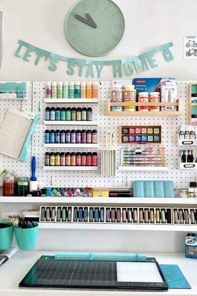 Instead of cluttered, which works well in craft rooms or bedrooms with limited space. Painting the pegboard a soft color.