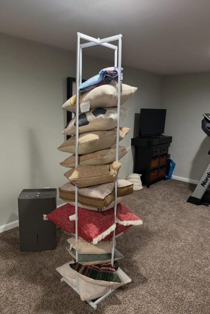 This solution works nicely in bedrooms, basements, or even fitness rooms where you need a convenient place to put additional pillows.