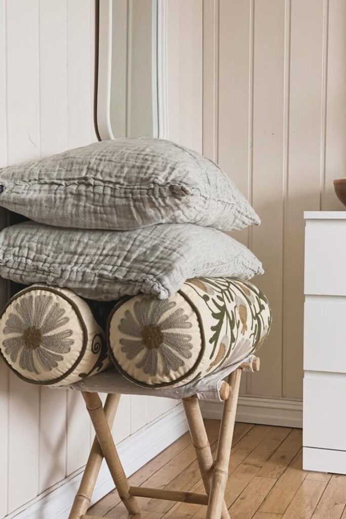 It’s easier to keep pillows close to where you use them. Put your daily-use pillows in easy-to-reach places like a storage bench, basket, or open shelf so you can grab them fast.