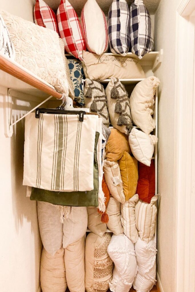 Put the pillows you use most often on lower shelves so you can get to them quickly, and put the ones you don’t use as often on higher levels.