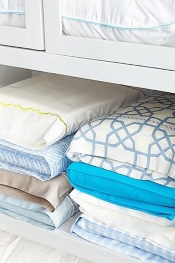 Keep them spaced out to keep their shape and use the whole area. This arrangement is excellent for things you don’t need every day, such cushions for guests or the holidays.