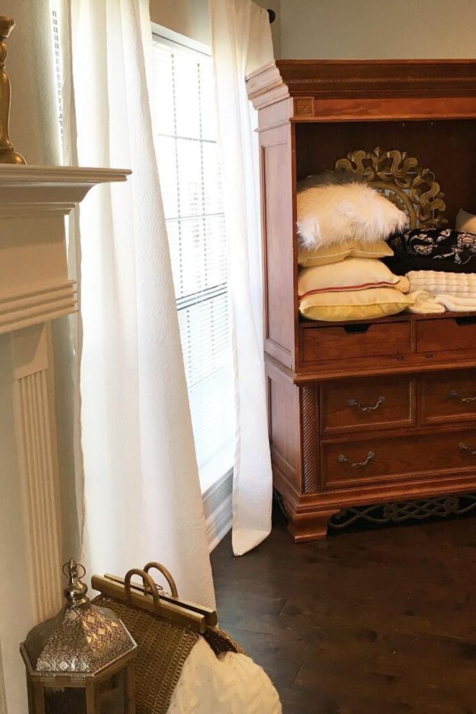 An open cupboard or hutch provides pillows a place to sit while still being part of the décor. Instead of crowding them tightly.