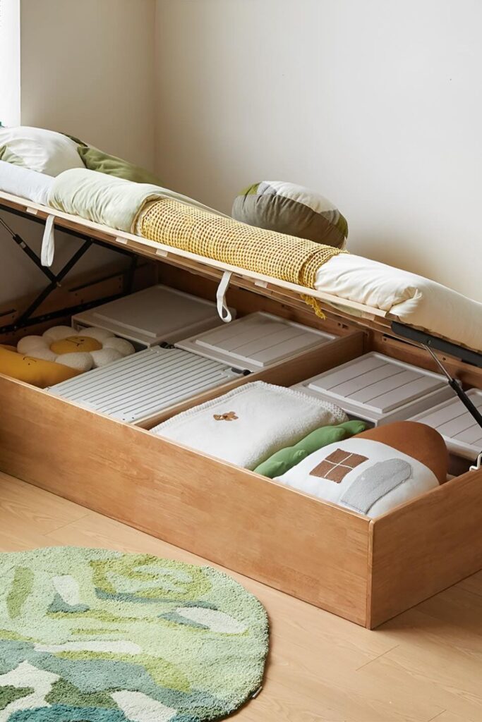 Hidden compartments under the bed can handle far more than most people expect. A lift-up bed creates a large storage space.