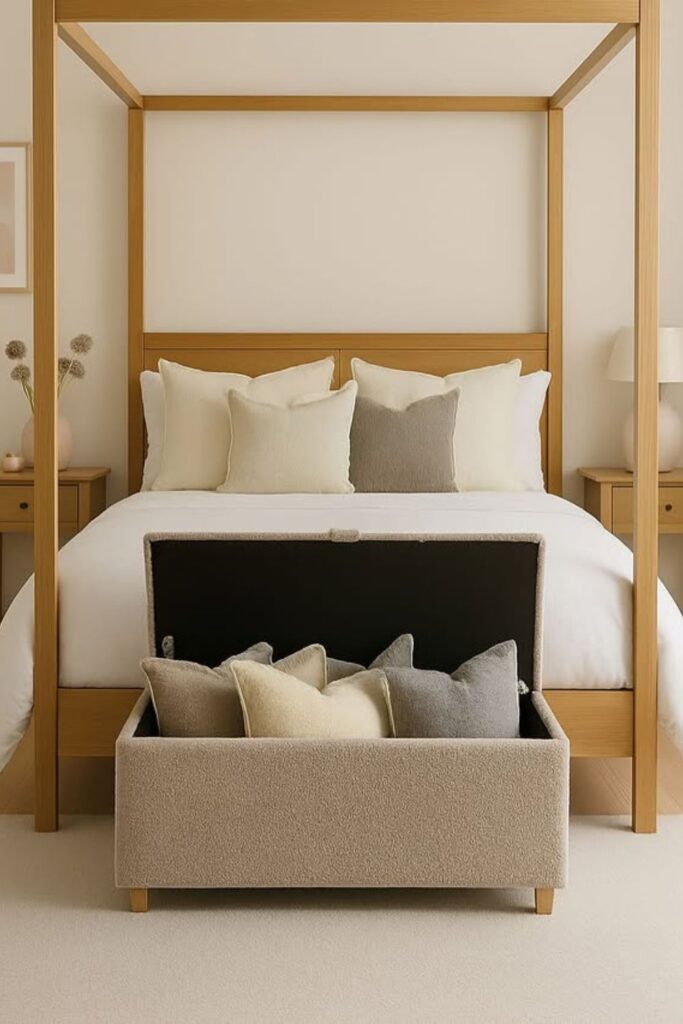 A storage bench at the foot of bed makes it easy to access anything, so you can drop pillows in without thinking about it.