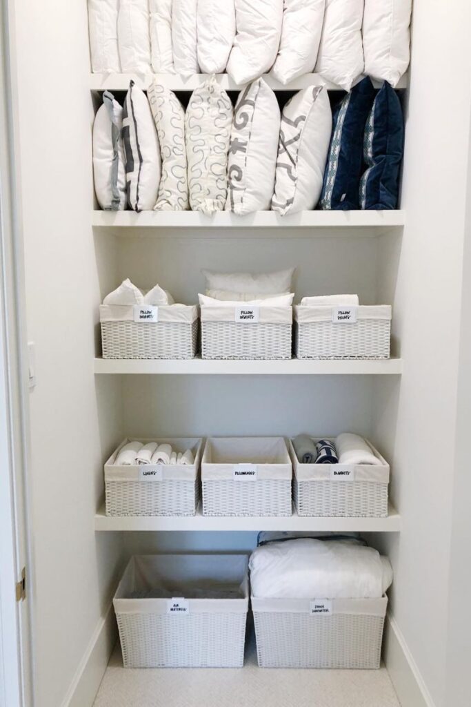 Organizing pillows becomes much easier once everything has a clear category. Labeled bins turn a basic closet shelf into a system.