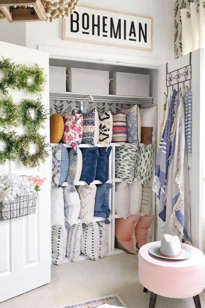 Tight spaces can still hold a surprising number of pillows when you use height instead of width. Putting them vertically in a closet keeps everything in one place.