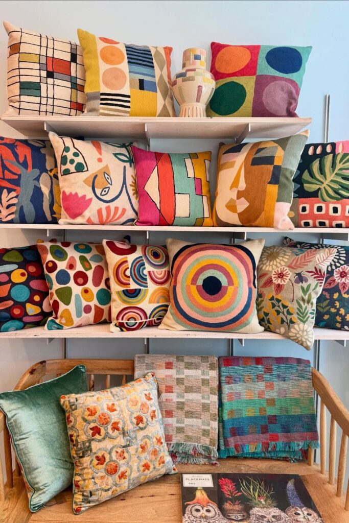 Colorful pillows don’t need to stay hidden when they can double as decor. Wall-mounted shelves give each pillow its own space.