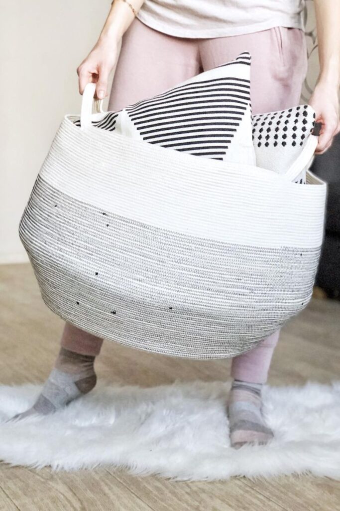 Quick cleanups become effortless when pillows have a grab-and-go spot. A large woven basket with handles.