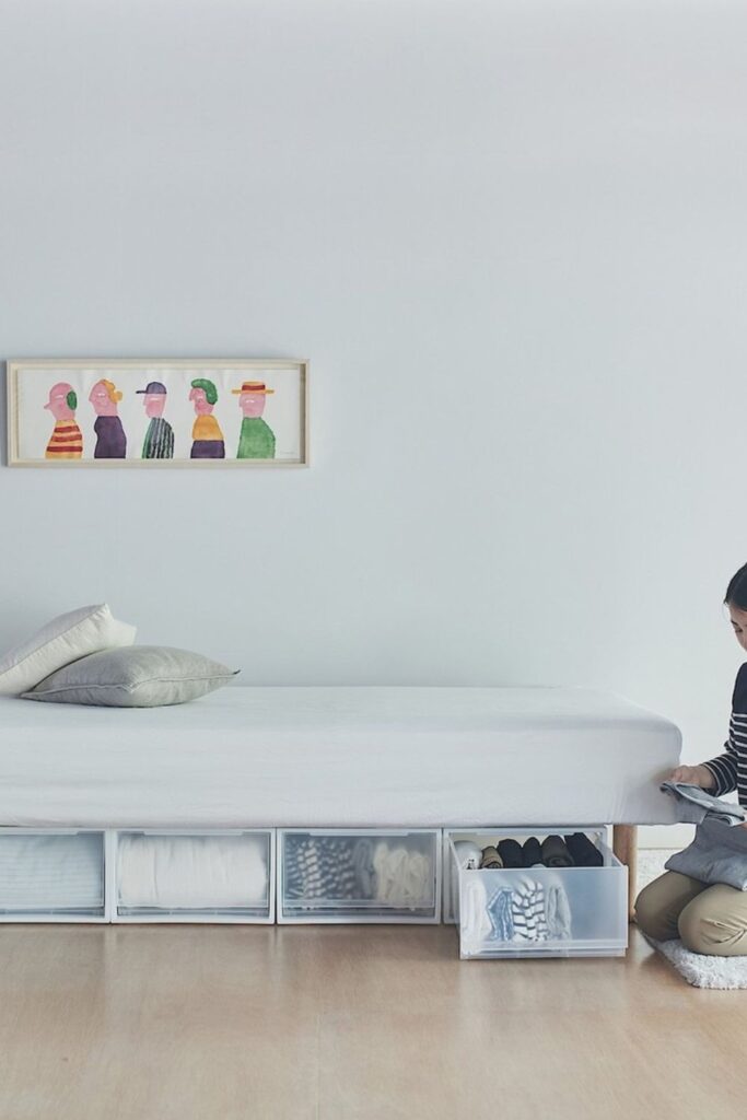 Hidden space under the bed can handle more than just forgotten items. Sliding storage bins underneath.