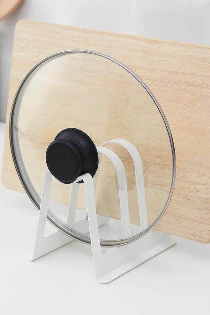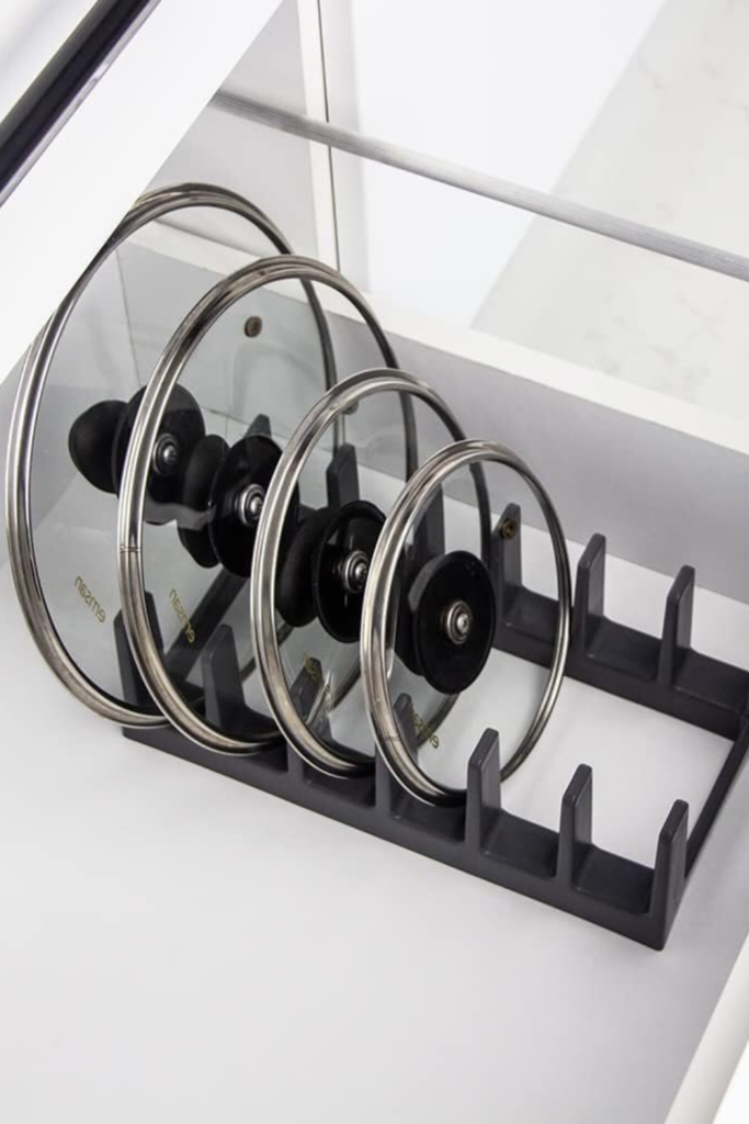 Countertop stands like this work best for everyday lids you grab constantly, especially in small kitchens where cabinet space is tight.