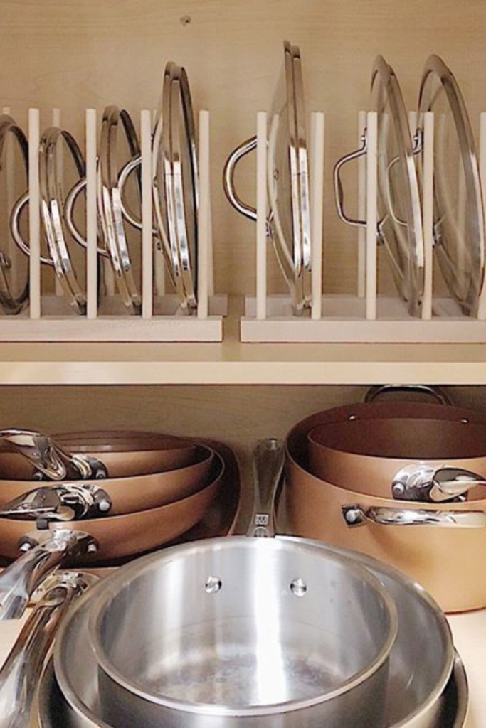 Space each divider according to the lid diameter. Larger lids should sit toward the back, smaller ones in front for quick reach.