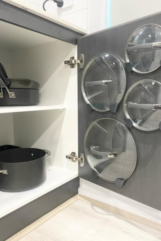 Mount slim lid holders on the door for flat pieces, then use vertical dividers inside the cabinet to file larger lids or pans upright.