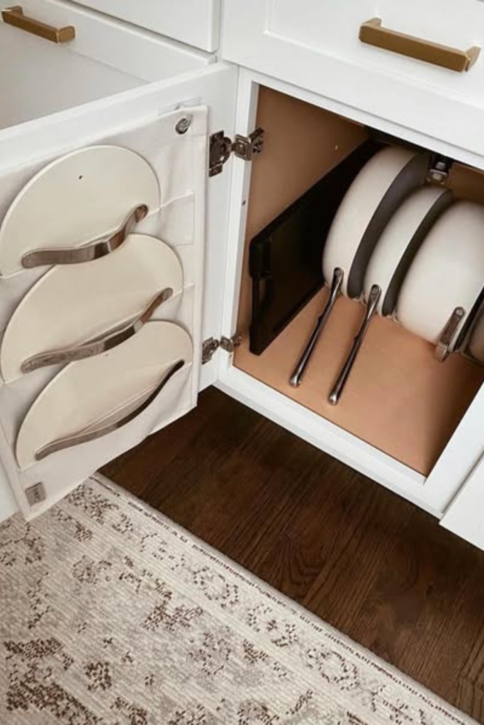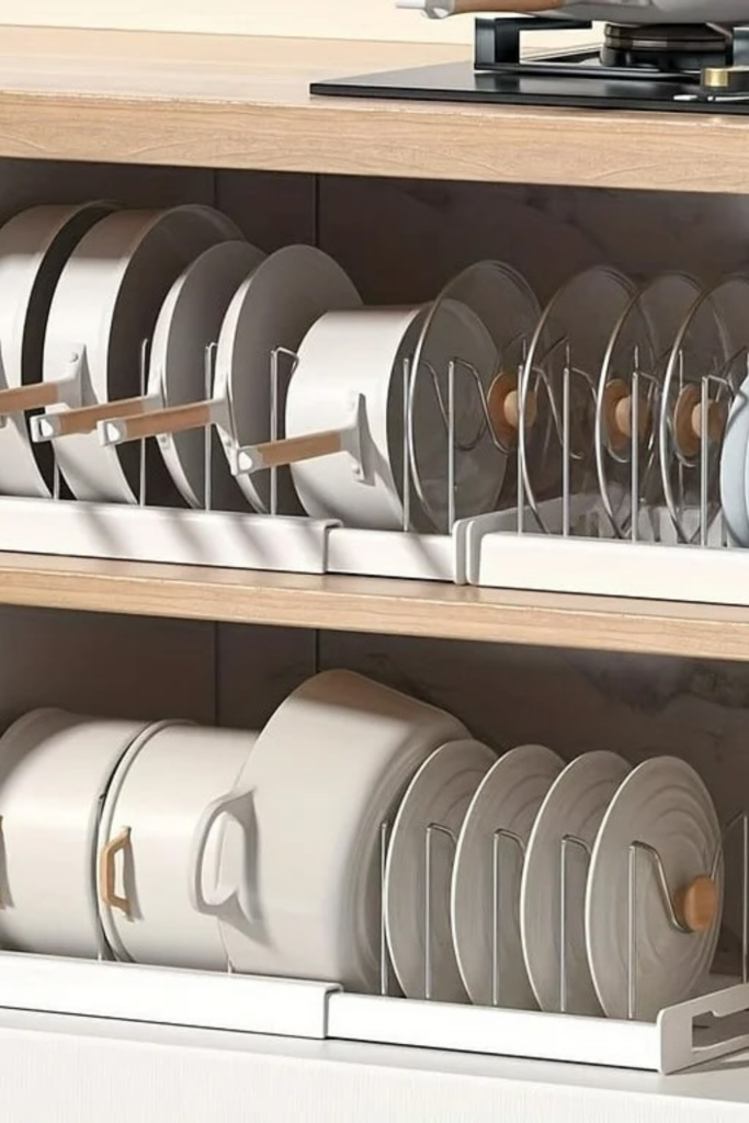 Smart kitchens separate lids and pans without wasting a single inch. Lower cabinets with enough depth handle this setup perfectly.