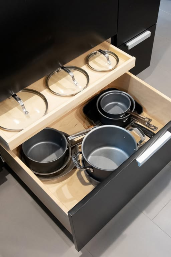 Cooking feels faster when lids and pots share a single, organized space. Wide base drawers work best for this layout.