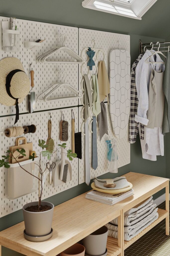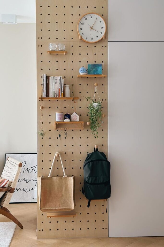 Empty wall sections can do much more than hold artwork. A pegboard turns that plain surface into flexible storage that adapts whenever your needs change.