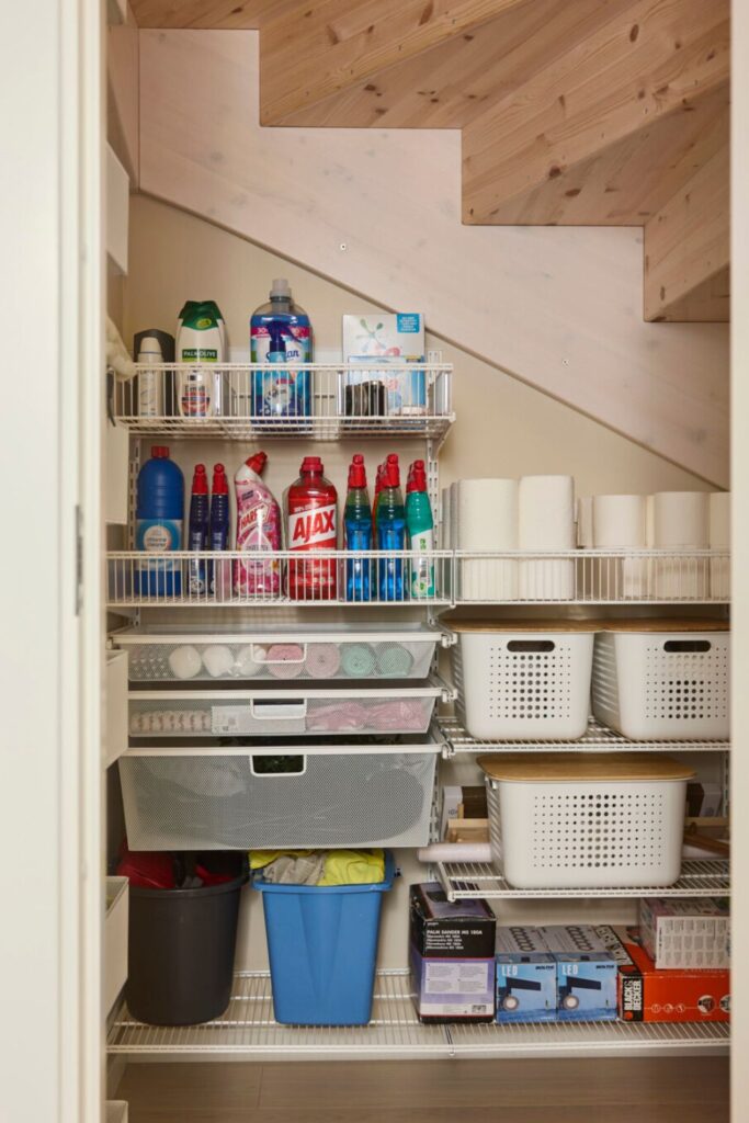 The higher levels are great for cleaning supplies, paper goods, and backups for the home. Smaller items like towels and sponges can be organized in pull-out baskets or boxes.