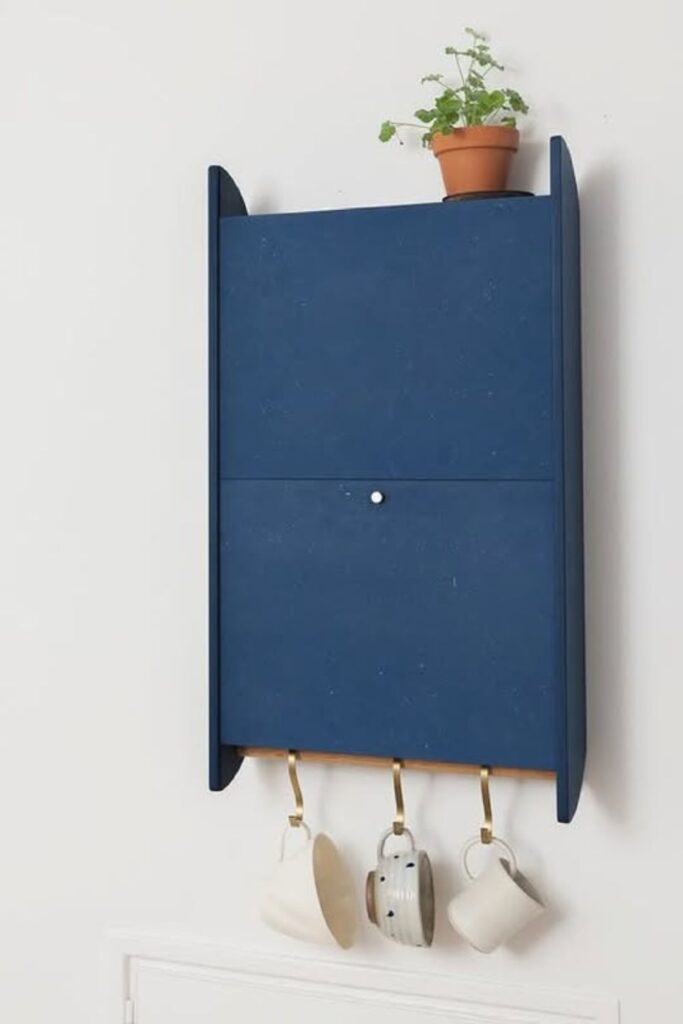 it puts everything in order and doesn’t take up room on the counter. The cupboard above hides tea, sugar, or tiny kitchen supplies, while the mugs hang neatly below.