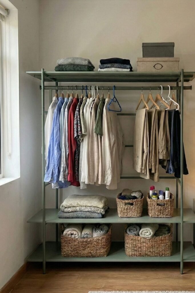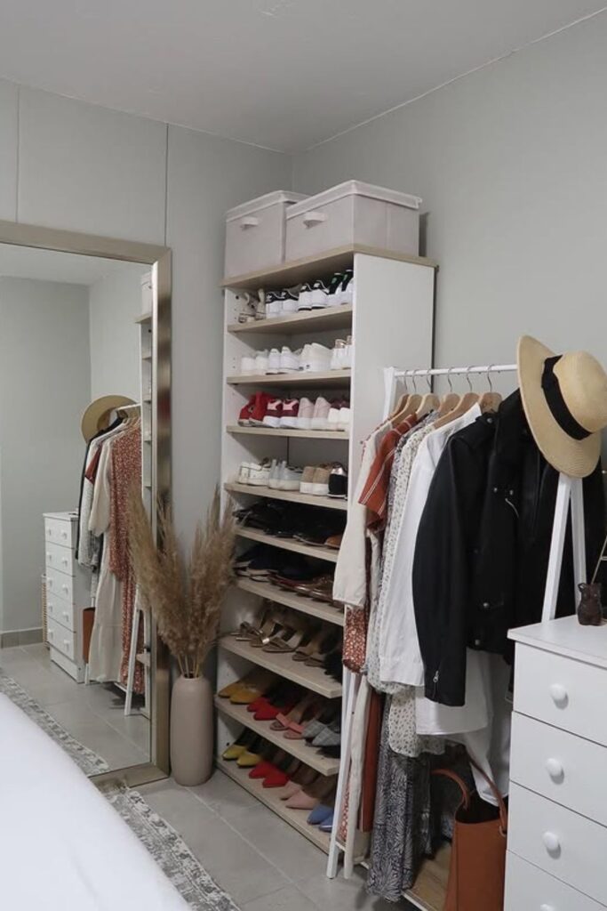 Closets often run out of space long before the rest of the room does. An open wardrobe like this turns one empty wall into a complete clothing station without needing built-in storage.