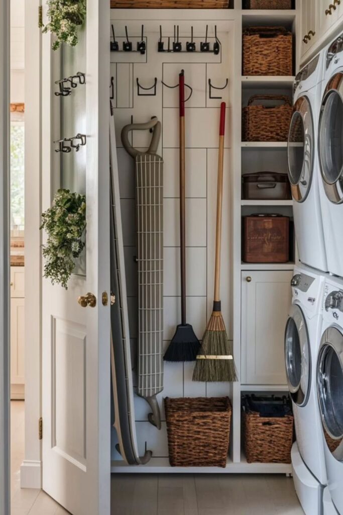 If you turn a small closet into a vertical tool station, everything will stay standing, be easy to find, and be in order. Wall hooks keep brooms, mops, and dustpans from sliding about on the floor.
