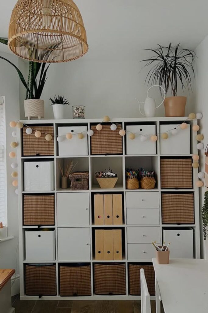 That keeps everything from workplace supplies to things around the house in one neat spot. Each square becomes a specific place for baskets, drawers, or folders.