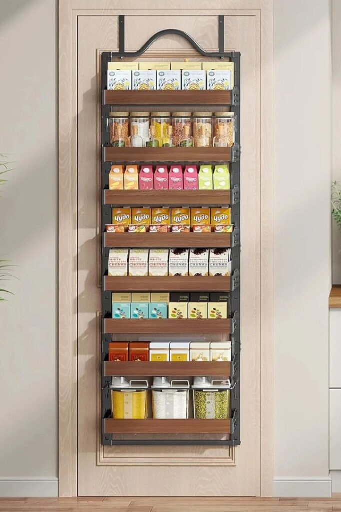 You can either attach a multi-shelf organizer straight to the door or use a strong over-the-door rack made for pantry storage.