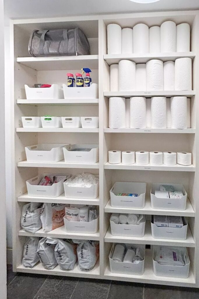 Household supplies quickly take over closets when everything gets stacked randomly. Open shelving paired with labeled bins turns that chaos into a simple supply pantry.