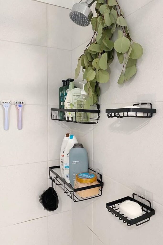 Shower bottles quickly take over the tub edge when there’s nowhere else to put them. Wall-mounted shower shelves solve that problem by stacking storage upward.