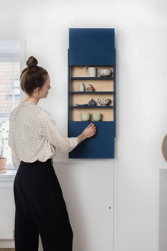 This setup is best for living rooms and tiny flats since it keeps the floor clear and turns an ordinary wall into a useful storage space.