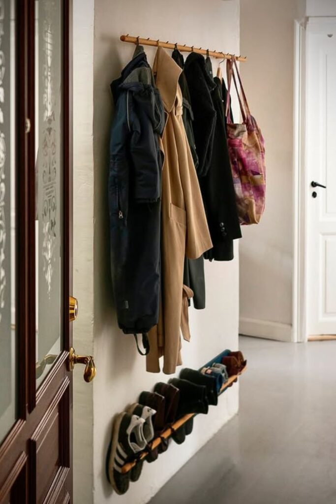 Most entryways already have space. Put up a narrow wooden rail with hooks high enough for coats and tote bags so that everything stays off the floor.