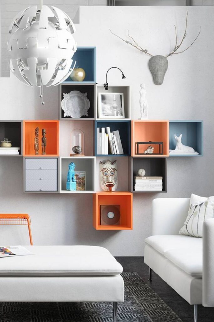 Living rooms often lack small storage spots for books, décor, and everyday items. A grid of cube shelves turns a plain wall into a functional display.