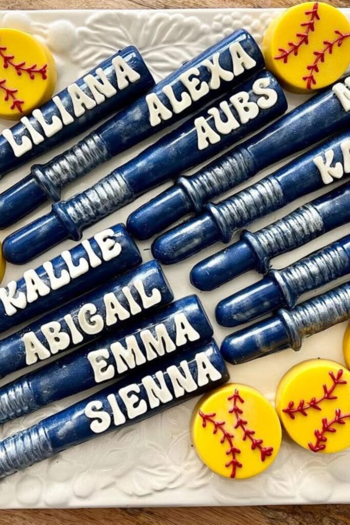 Start with softball-themed cookies decorated with vibrant icing that mimics stitching on a softball.