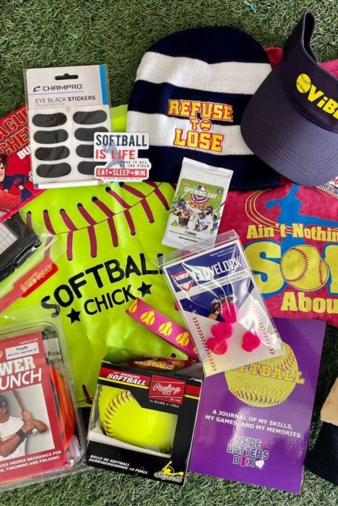 Create a vibrant gift bundle packed with softball-themed must-haves.