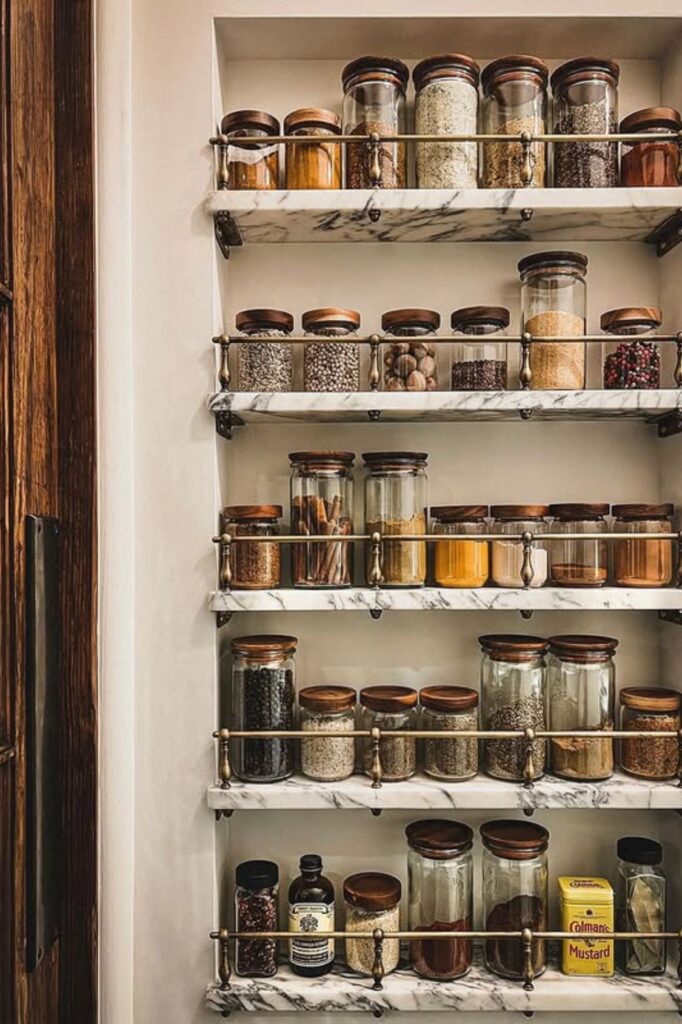 Empty wall space can quietly turn into your most useful storage spot. Floating shelves like these keep spices off crowded counters.