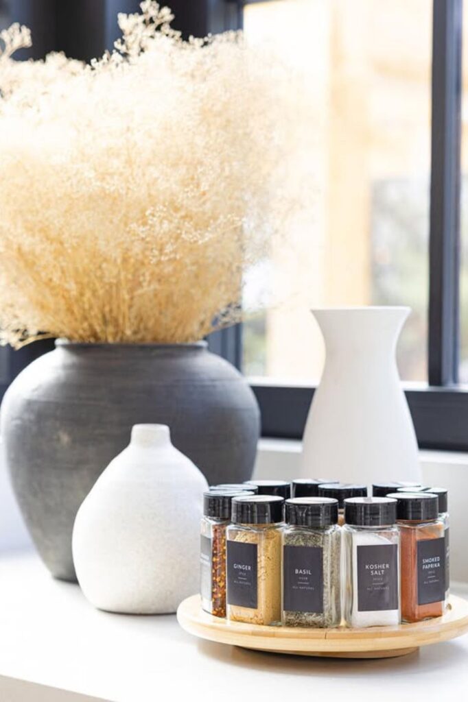 This arrangement is excellent for a window or prep area where you use spices every day. To recreate it, just put a wooden or marble tray on top of the jars.