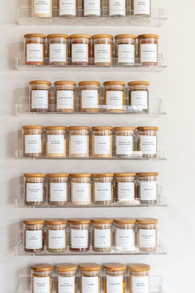 Clear racks keep the focus on the spices, not the storage. Mounting slim acrylic shelves like these turns a blank wall into a full spice.