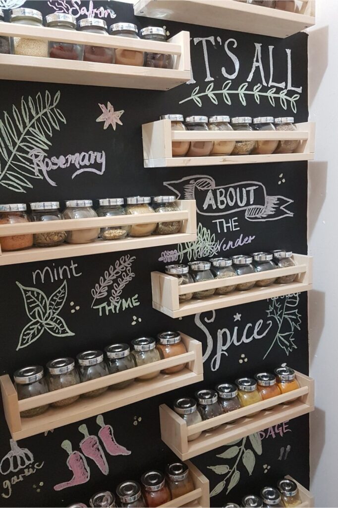 And keeping the shelves regularly spaced maintains the arrangement balanced. This little space can replace messy cabinets and make it easy to get to your spices.