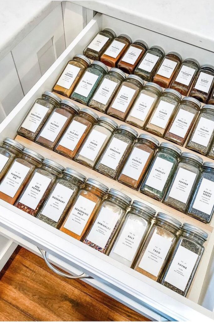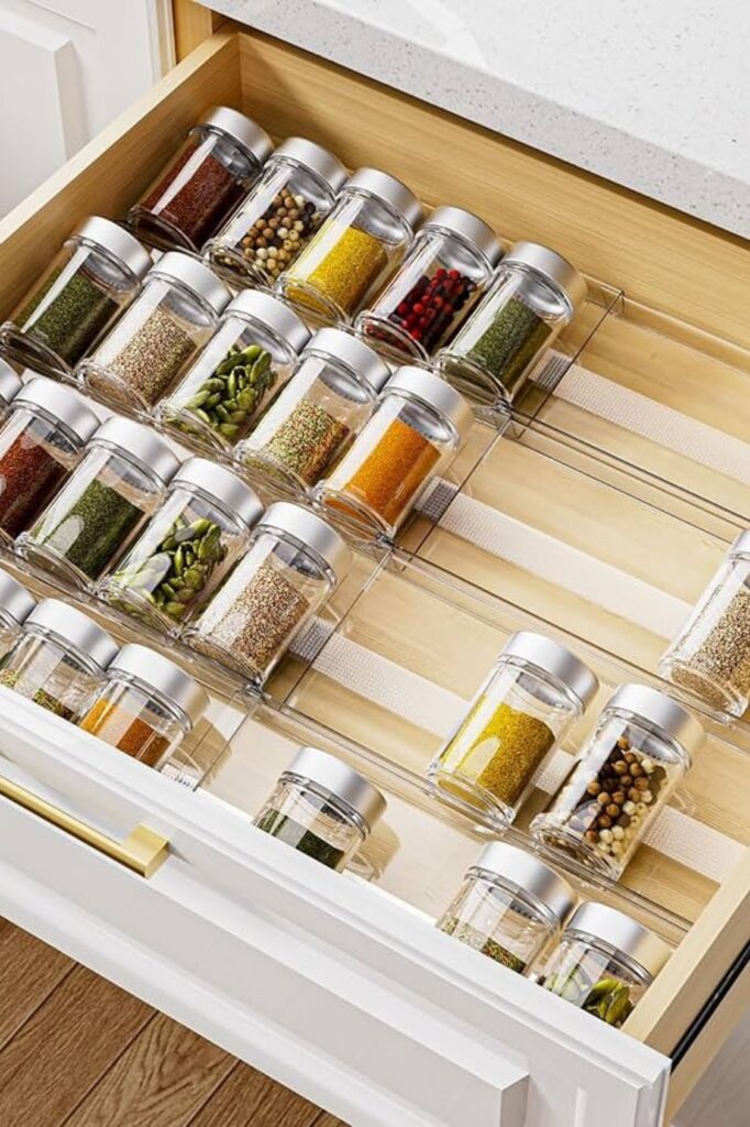 A fitting insert or separator keeps everything in place. Even a lot of spices feel ordered once they’re in order, and closing the drawer hides all the mess right away.