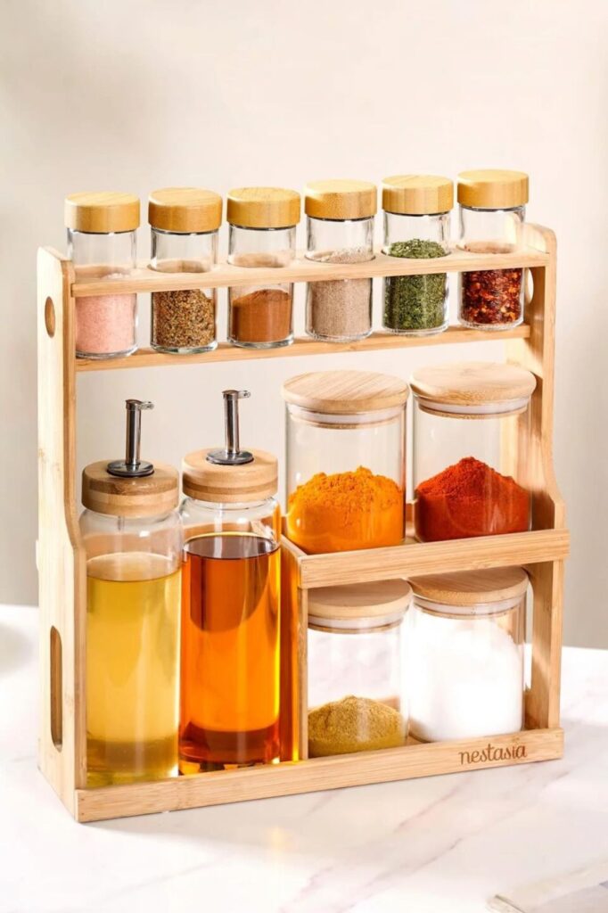 Clutter disappears the moment every jar gets its own visible spot. A multi-level rack like this turns a flat, crowded shelf.