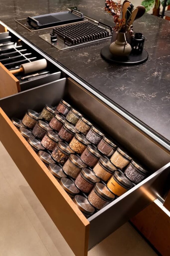 Hidden storage feels effortless when everything sits neatly in one layer. A deep drawer like this turns a bulky spice collection into a clean.