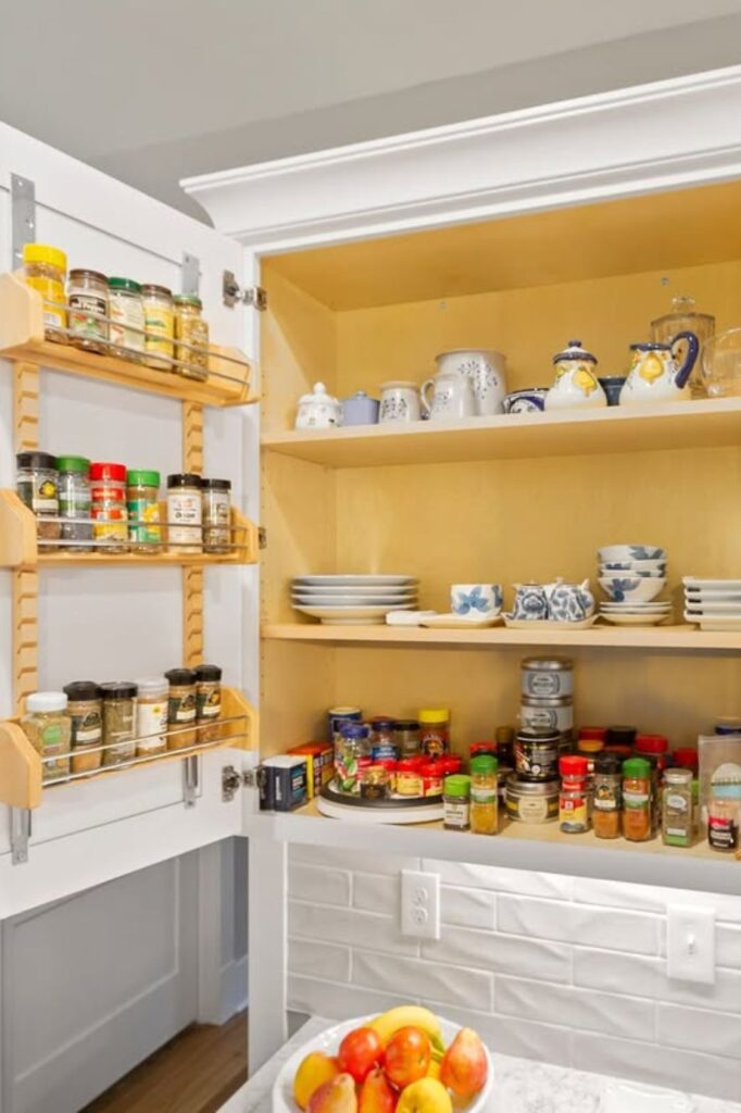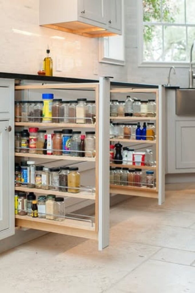 Use little spaces that are usually unoccupied to create a full-height spice section without taking over the major shelves.
