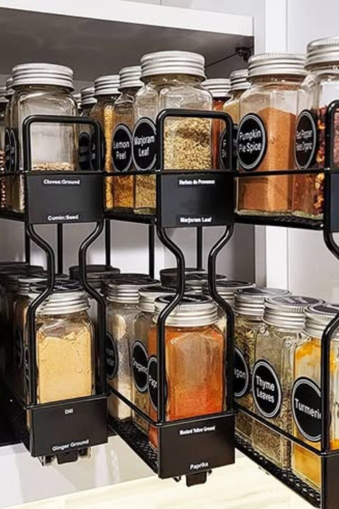 Use tiered shelves, drawer organizers, or wall racks to make the most of vertical space. When spices are simple to see and reach, you save room and cook much faster.