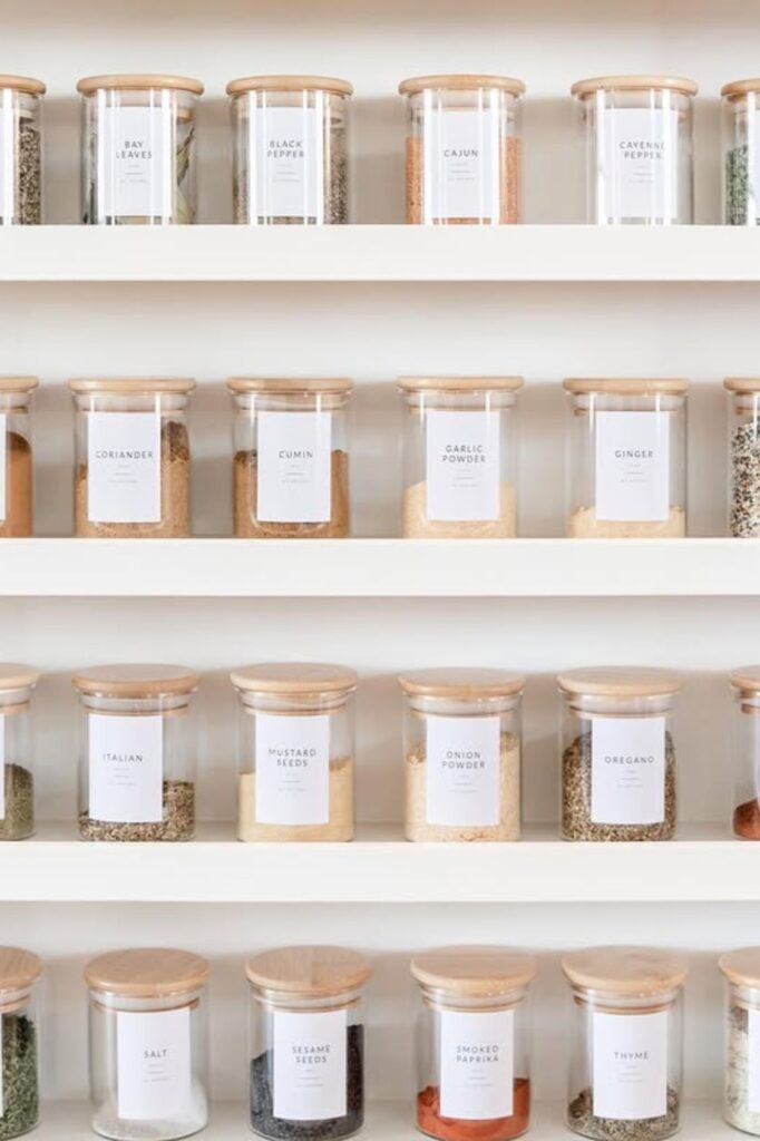 These wide shelves offer each jar space to breathe, so nothing seems cramped or buried. Even with a lot of stuff, matching containers make everything look neat right away.