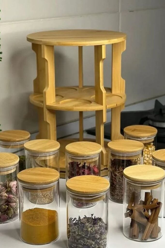 The tiered design uses vertical space without making the counter look messy. Smaller jars go on top, and bigger jars and oils fit well below.