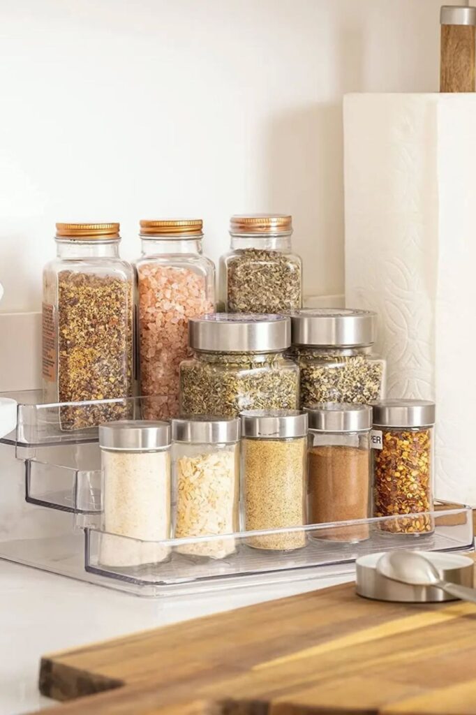 This means you won’t have to search through jars or knock them over when cooking. It’s easy to set this up: just put a ready-made tiered rack in a cupboard or on the counter.